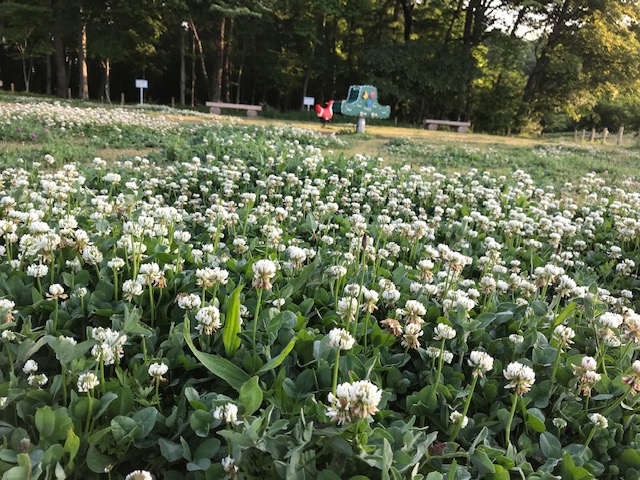 マメ科の多年草でヨーロッパ原産。江戸時代に渡来し、野生化した。「しろつめくさ」は俗称。通常は三つ葉だが、稀に四つ葉のものがあると幸運をもたらすものとして珍重される。晩春に、白い鞠状の花を咲かせる。春たけなわの伸びやかな地の起伏や空間を感じさせる季語だ。