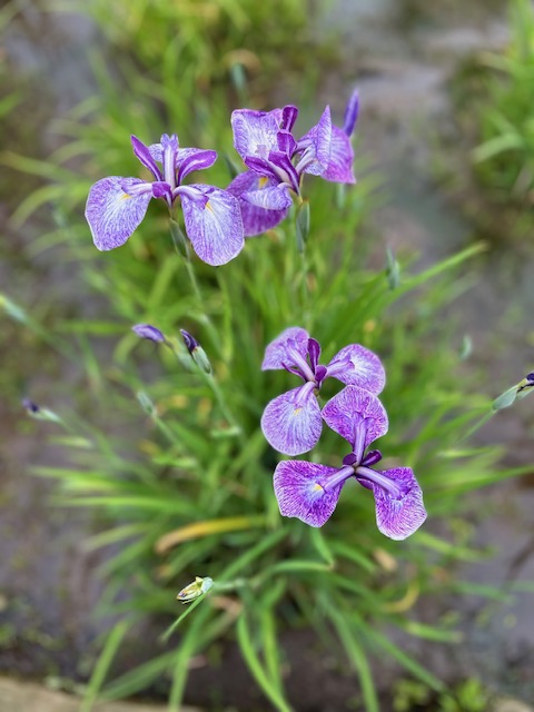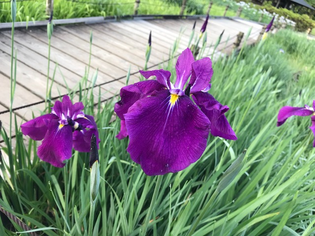アヤメ科の多年草。ノハナショウブを原種として改良された園芸植物で多くの品種がある。江戸系、肥後系、伊勢系などの系統があり、5月下旬~6月に、花茎の頂に典雅な花をつける。花弁の基の黄色い目形模様が特色。なお、端午の節句に菖蒲湯にするショウブは、ショウブ科に分類される別種の植物。