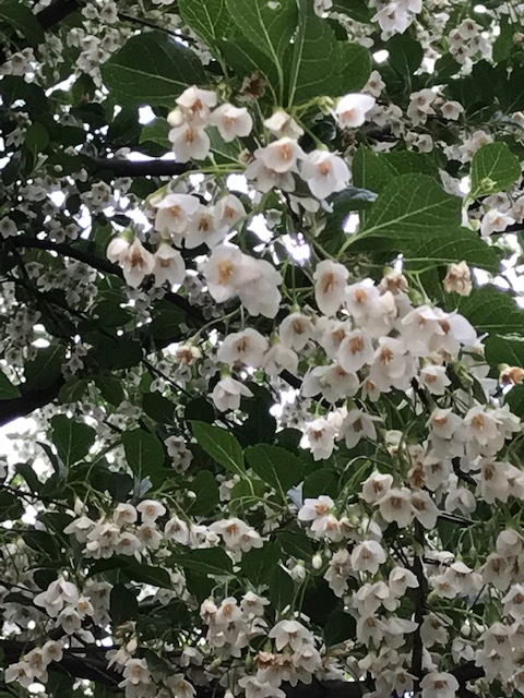 山野に自生するエゴノキ科の落葉高木。枝先に真っ白な5弁花が群れ咲く。山野に自生するほか、庭園などにも植えられる。夏の初めの頃、地面に花びらが散り敷いていて、頭上にかぶさるように群がり咲くこの花に気づくことが多い。昔は、果実を石鹸と同じように洗浄剤として洗濯などに用いたという。