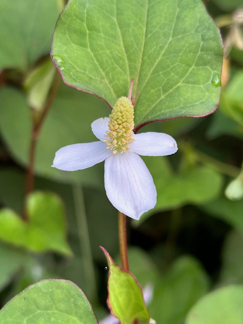 ドクダミ科の多年草。5月下旬から梅雨の時季にかけて、日陰の湿った場所に繁茂する。独特の癖のつよい臭気があるが、古来からの薬草で10の効能があるとされ、「十薬」とも呼ばれる。白い花びらのように見える部分は葉が変化した総苞片で、花は中心の突出した黄色い部分のみだが、一般には、この白い総苞片を花と呼んでいる。