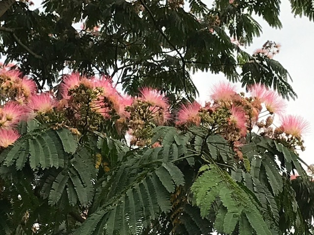 合歓(ねむ)はマメ科の落葉小高木。日本在来の植物で、本州から沖縄にかけて広く自生するほか、寺院や庭園にも植えられる。6、7月頃紅又は白色の小花が球状に集まって咲く。夕方に開き、翌日にはしぼむ。 長く伸びた糸状のものは雄しべ。和名の由来は、夕方になると葉が合わさって閉じてしまう様子をたとえたもの。