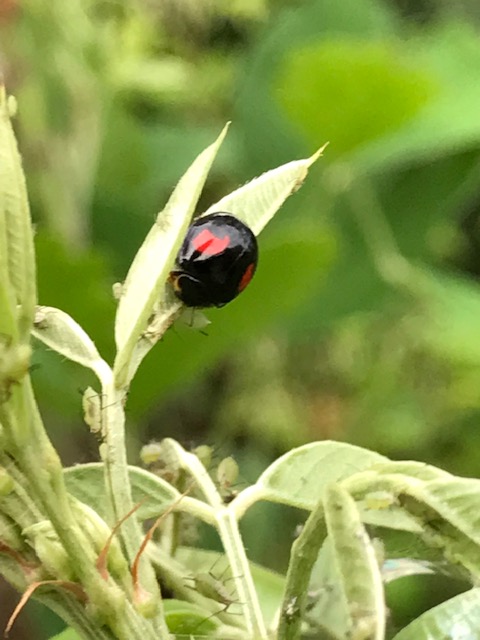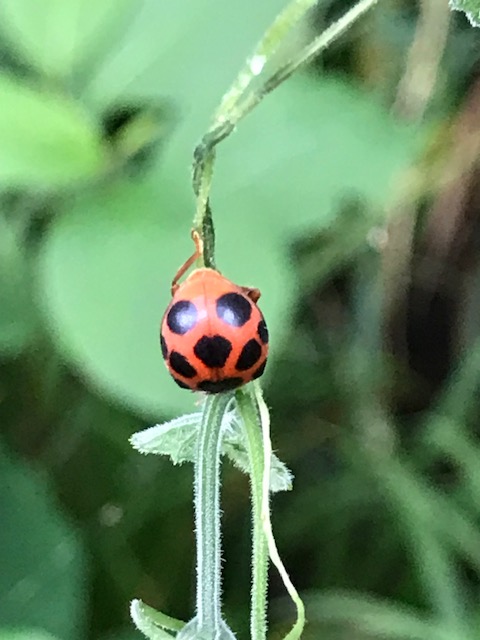 「天道虫」はテントウムシ科に属する小形の甲虫。枝などの先端まで登って行き、行き場がなくると太陽に向かって飛び立つ習性があることからこの名がある。成虫は半球形で、短い脚や触角をもつ。体の表面には光沢があり、色も星の数も種類によって様々だ。固い鞘翅の下に畳み込まれた翅を広げて飛ぶが、木の葉や枝を這いまわっていることが多い。