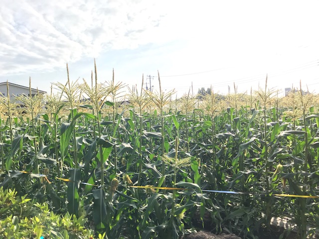 玉蜀黍はイネ科の一年草で、アメリカ原産。米・小麦とともに、主食として食べられる世界3大穀物の一つ。地方により、唐黍、南蛮などの呼び名がある。雌雄異花。すぐに目につくのは茎のてっぺんの雄花で、雌花は葉腋につき、包葉に包まれた円柱状の花穂をなす。