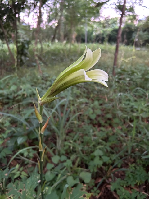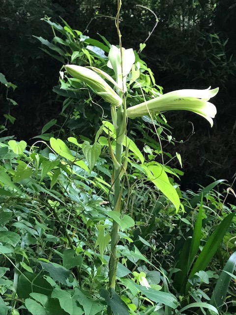 ユリ科ウバユリ属の多年草。関東以西の本州、四国及び九州に自生し、林内の木陰などやや薄暗い場所に見られる。百合に似た花をつけるが、葉は大きく異なる。花が満開になる頃には葉が枯れることが多いため、歯(葉)のない姥にたとえて名づけられた。7、8月頃、茎の先端に緑白色の漏斗型の花を2~4個つける。筒状の六弁花で内側には紫がかった褐色の小さな斑点模様が入る。百合の花(夏季)の傍題。