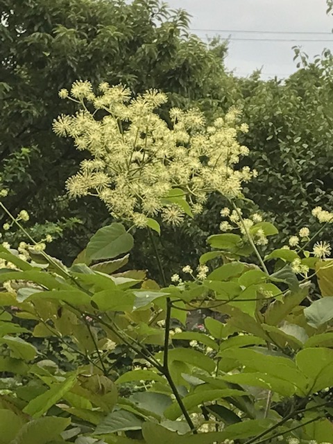 ウコギ科の多年草。日本全国の山野の日当たりの良い場所や、半日陰の斜面や崖などに自生し、栽培もされている。晩夏の頃、茎頭や葉腋から伸びた花茎に白や淡緑色の小花を丸いぼんぼりのように群がり咲かせる。雌雄同株で上部に両性花、下部に雄花をつける。山菜として食用にされるのは早春の頃の若芽や根茎。