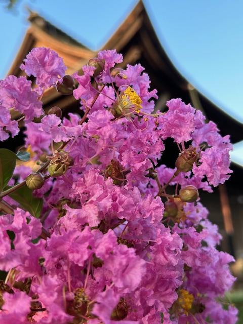 ミソハギ科の落葉高木。中国南部原産で、江戸時代以前に観賞用として日本に渡来。庭や公園、街路沿いに植えられているのをよく見かける。猿でも滑り落ちるほど樹皮が滑らかなことからこの名がある。晩夏から初秋にかけて、白や紅、ピンク、紅紫色の小さな六弁花を円錐状に次々と咲かせる。一花一花は開花したその日のうちに萎んでしまう一日花であるが、蕾が次々と開花するため、百日紅(ひゃくじつこう)の別名どおり100日近く咲き続ける。