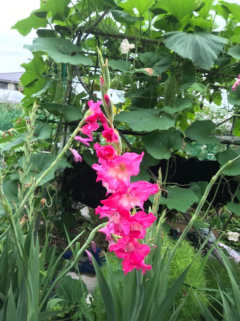 アヤメ科グラジオラス属の多年草。南アフリカ等の数種の原種の交雑により作り出された園芸品種。球根で増える。名の由来はラテン語の「剣」という意味のグラディウスで、葉や蕾の形からきている。剣状の葉の間から花茎を伸ばし下から上へと咲き登る。六弁の漏斗状の花は赤、黄、橙、白など色も豊富。