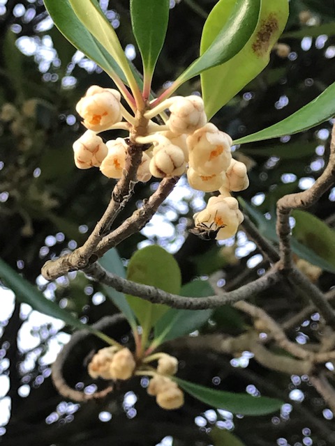 木斛(もっこく)はツバキ科の常緑高木。暖地の海岸に自生するほか、庭園には欠かせない庭木で、古くから武家屋敷、寺院などに植えられてきた。仲夏の頃、白い五弁の小花を下向きに開く。地味な花だが、微かに甘い香りを放ち、蜂などの昆虫がよく集まる。晩秋、緑だった実が赤く熟し、実の皮が割れて種が覗く。