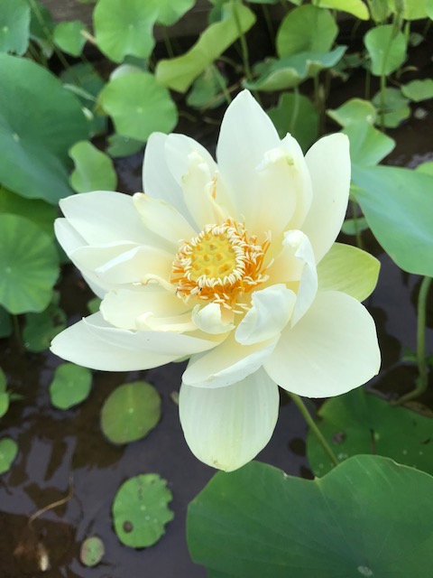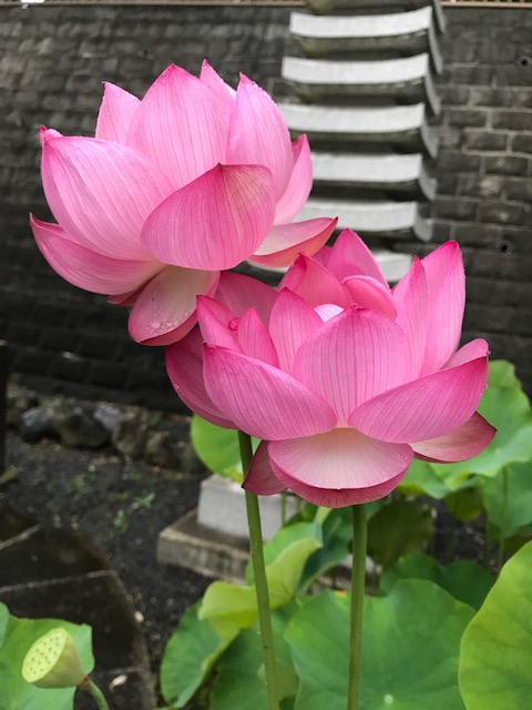 インド原産のハス科の多年生水草。蓮根が食用になることから、古くから各地の池や沼、水田で栽培。梅雨明け前後に茎を直立に伸ばし、宝珠の形をした蕾をつけ、夜明けに淡紅色、紅、白などの大形の花を開く。朝早く開き昼頃に徐々に閉じる。咲いて4日目ほどで散り始める。花が終わると花托が生長し蜂の巣のような形になることからハチス(蜂巣)とも呼ばれる。
