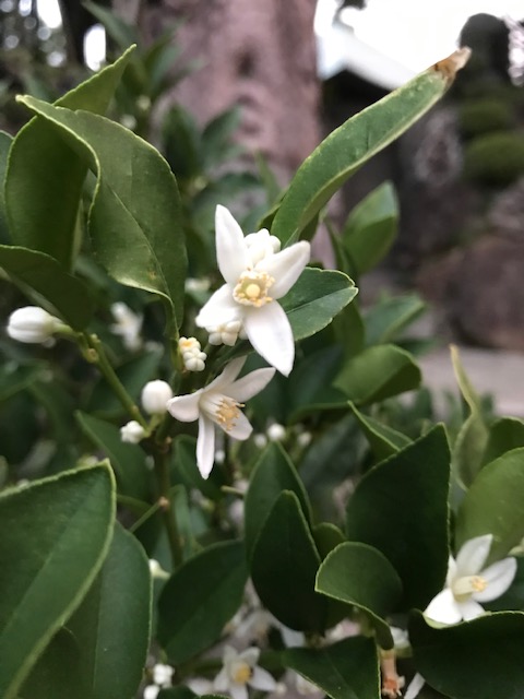 柚子は、中国原産のミカン科の常緑樹で平安時代に日本に渡来。耐寒性があるため、山地などでも栽培されている。5月に独特の香りをもつ小さな五弁花をつける。実は薬味等として、日本料理では珍重されている。単に柚子といえば果実を指し、秋の季語。また、熟す前の青柚子は夏の季語。