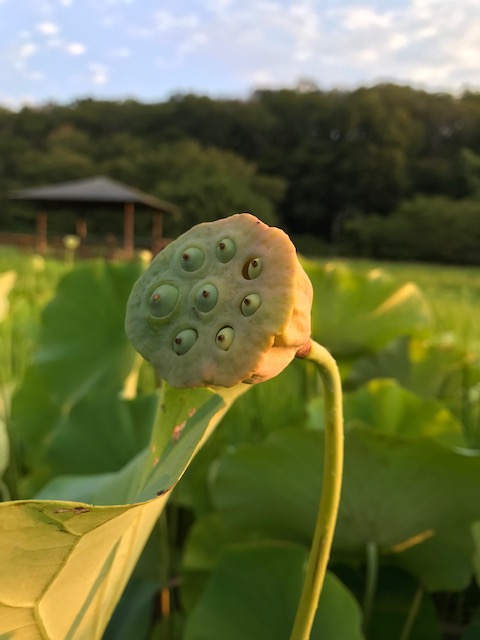 蓮は花が終わると、漏斗状の花托(かたく)となり、蜂の巣のような孔が並び、この巣孔から黒く熟した種子が飛び出して水中に落ちる。種子の果皮は堅いが、中の子葉・幼芽は甘く、生のまま食べられる。松の実やクコの実と並び、健康食品として珍重されている。