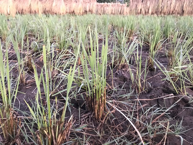 稲を刈り取った後の刈株に萌え出る青い新芽のこと。稲刈りが早い場合は穂が出て実ることもあり、野鳥や家畜の餌になる。初めは青々としていた穭田も、霜の降るたびに枯れて冬を迎える。