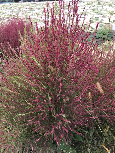 別名箒草(ほうきぐさ)、園芸ではコキアとも呼ばれる。中国原産のアカザ科の一年草で、荒れ地に自生するほか、栽培もされている。晩夏の頃、淡い黄緑色の小花をつける。秋になると次第に小枝まで赤味を帯び、その実はとんぶりと呼ばれ東北地方などでは食用になる。箒の材料となる草である。なお、とんぶりは畑のキャビアとも呼ばれ、秋の季語。