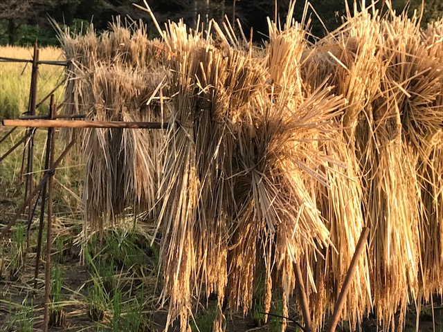 刈り取った稲を天然乾燥させるための木組みのこと。田の中に設けた簡単なものから樹木に竹を結わえ数段にも及ぶものまで様々だ。刈り取った稲の束を稲架に掛けて数日干し、脱穀する。現在では生脱穀、火力乾燥の方法が多くとられ、稲架などによる天日干しは少なくなった。