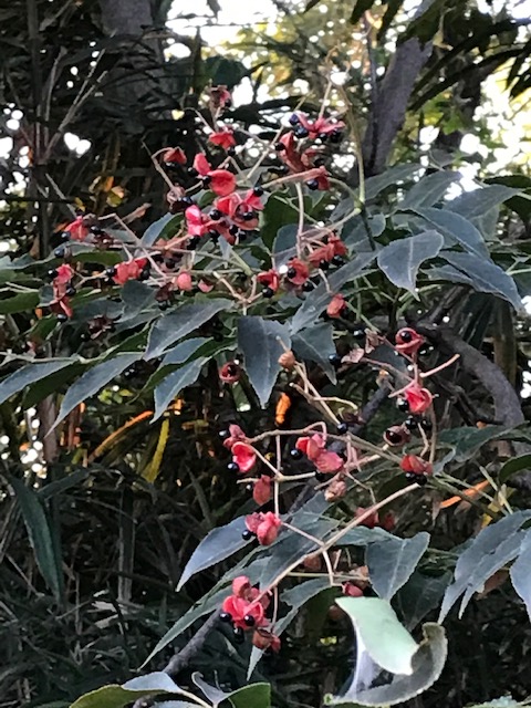 臭木(くさぎ)はクマツヅラ科クサギ属の落葉小高木で山野の日当たりのよいところに自生。初秋の頃、枝先に香りのよい白い花が群がり咲き、秋の深まる頃、実が光沢のある藍色に熟す。