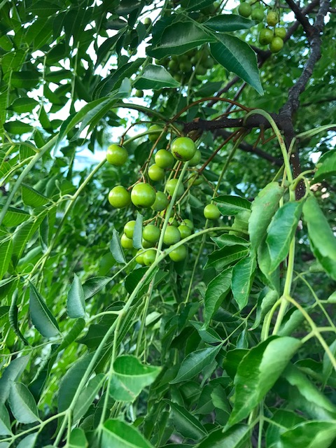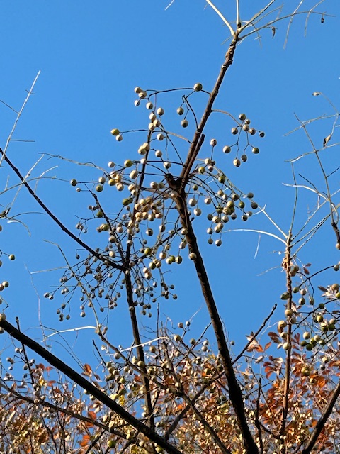楝はセンダン科の落葉高木。暖地の海岸沿いや山地に自生する。実は初めは青いが、晩秋に黄色く熟し、サクランボのように花束状の枝に鈴のように下がる。葉が落ちても梢に果実が残り、鵯などが啄ばむ。栴檀(せんだん)の実、金鈴子(きんれいし)ともいう。