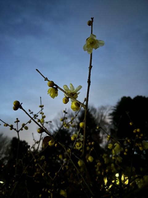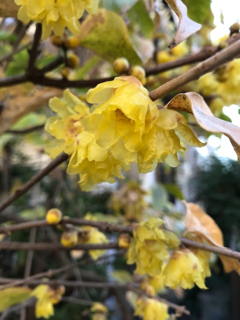 中国原産のロウバイ科の落葉低木で17世紀初頭に日本に渡来。観賞用として庭木や鉢植えにされる。冬、おおかたの葉が落ちた後、香気のある黄色の花をつける。花びらは蠟細工のように半透明で光沢がある。「臘梅」とも表記する。別名「唐梅」「南京梅」。