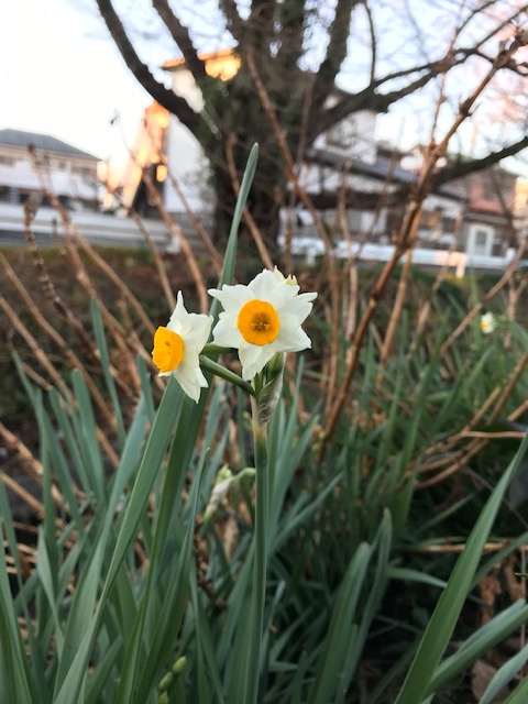 地中海沿岸原産のヒガンバナ科の多年草で、関東地方以西の海岸近くに自生するほか、観賞用として公園や庭に植えられる。晩冬の頃、葉の間から直立した花茎に、数個の花を横向きにつける。白い花の中心に黄色い副花冠があるラッパ形のもののほか、八重のものなどがあり、すがすがしい芳香をもつ。