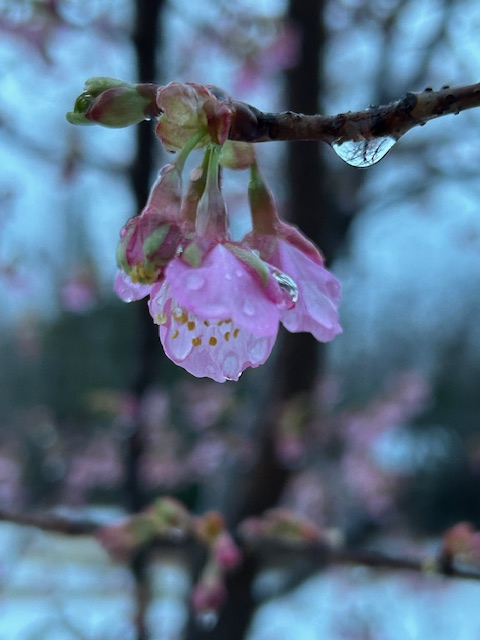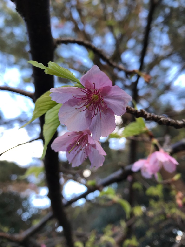 日本固有種の大島桜(春季)と緋寒桜(冬季)の自然交雑から生まれた日本原産の栽培品種のサクラ。静岡県賀茂郡河津町に多く自生する。「河津桜」の通常の花期は、ソメイヨシノなどに比べて早く、関東近辺では2月から3月上旬で、一重で淡紅色の花をつける。