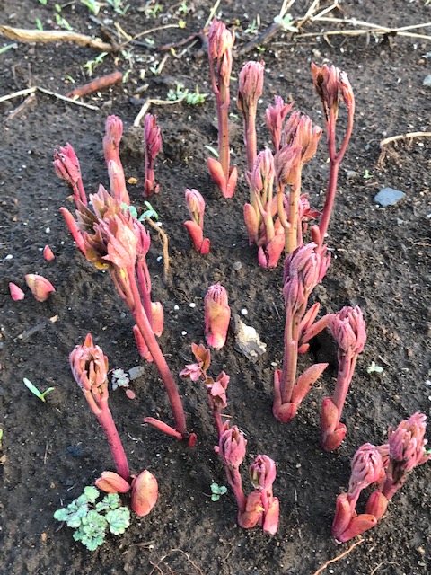 「芍薬(しゃくやく)の芽」は「草の芽」の傍題。芍薬はボタン科ボタン属の多年草。春に地上から芽を伸ばし、初夏の頃、茎先に大型の華やかな花を咲かせる。ボタンに似ているが、ボタンは木本で冬も枝が残るのに対し、シャクヤクは草本で冬は地上部が枯れ、地中の根や芽で冬越しする。