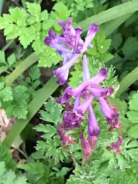 中国原産のケシ科の多年草で、室町期に日本に渡来。晩春の頃、花茎に薄紅色の袋状の花をいくつも垂らす。その形が仏具飾りの華鬘に似ていることからこの名がある。日本の自生種である紫華鬘(写真)は湿った山地などに、黄華鬘は海岸付近に自生する。