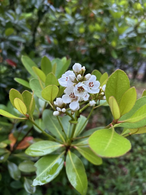 日本・東アジア原産のバラ科シャリンバイ属の常緑低木。東北地方南部以西の海岸近くに自生するほか、庭木や公園樹として植栽される。初夏の頃、白または淡紅色の五弁花(両性花)をつけ、秋に球形の果実が黒紫色に熟す。歳時記には掲載されていない。