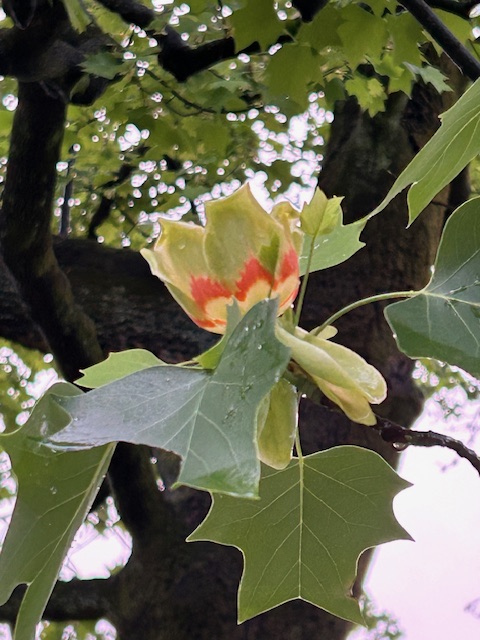 「ゆりの木」は、北アメリカ原産のもくれん科ユリノキ属の落葉高木。別名「チューリップツリー」。明治初期に渡来し、公園木や街路樹としてよく使われる。初夏の頃、枝先に椀形・チューリップ形の黄緑色の花が上向きに咲く。花の基部にオレンジ色の斑紋がある。