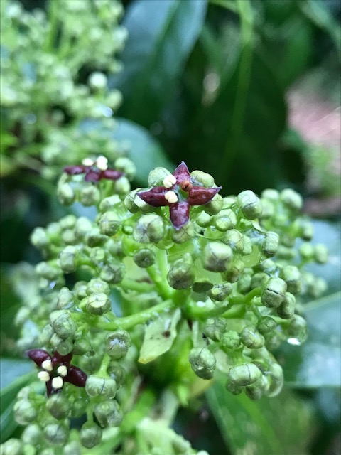青木は日本原産のミズキ科の常緑低木。本州以南の山地の日陰に自生するほか、庭木としても植えられる。雌雄異株で、晩春の頃に目立たないえび茶色の小さな四弁花を枝先に咲かせる。冬には赤い実が生る。