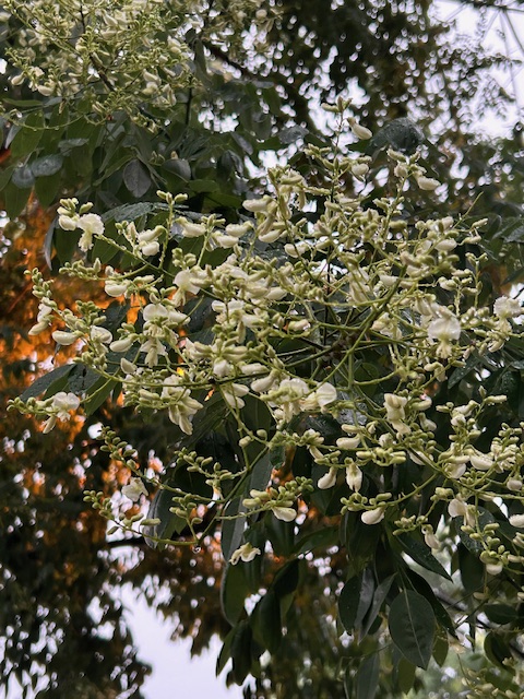 「槐(えんじゅ)」は中国原産のマメ科の落葉高木。古く日本に渡来し、街路、公園、学校などに植えられる。梅雨明けの頃、黄味がかった白色の蝶形花が穂状に集まって咲く。蜂などの重要な蜜源植物でもある。