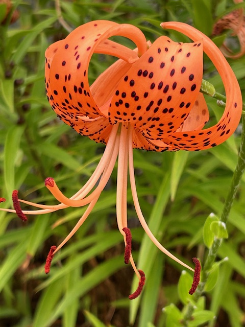 中国又は朝鮮半島南部原産のユリ科の多年草。食用として渡来したものが野生化し、現在では日本各地の山野に自生する。盛夏の頃、濃褐色・オレンジ色の6弁花を咲かせる。花弁は強く反り返り、紫色の斑点がある。種子は作らないが、葉の付け根に暗紫色のムカゴを作る。鱗茎は山百合と同様、ユリ根として食用になる。「百合の花」の傍題。
