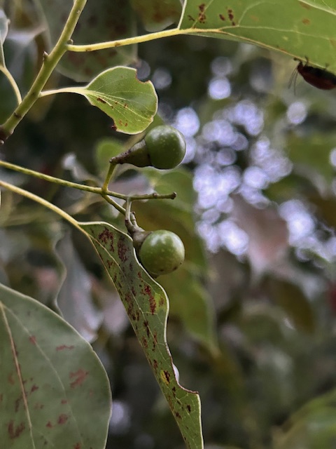 「樟(くす)」はクスノキ科の常緑高木。暖地に自生するほか、街路や寺院、庭園などに植えられる。初夏に黄白色の小花を多数つけた後、秋に丸い実が生り、熟すると黒くなる。ムクドリやヒヨドリが実を食べて、種子が散布される。