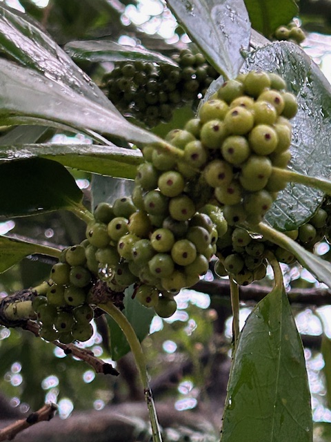 「多羅葉(たらよう)」は本州以南の暖地の山地に自生するモチノキ科の常緑高木。雌雄異株。庭や寺院にもよく植えられる。初夏の頃、葉腋に淡黄緑色の花を多数つける。花の後、雌の木には球形の実が赤く熟す。葉の裏面を棒などで傷付けると、その部分だけが黒く残る性質を持つ。なお、花も実も歳時記には掲載されていない。