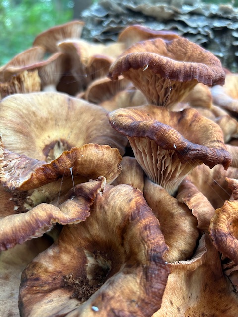 林に群生する茶色の茸。晩夏から秋にかけて広葉樹林の枯木、切株、立木の根元に群生する。公園や街路樹などでも見ることができる。楢茸(ならたけ)より味は落ちるが食用。楢茸は歳時記に掲載されているが、本種は掲載されていない。