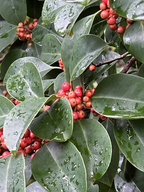 黐(もち)はモチノキ科の常緑小高木で、暖地の山野に自生するほか、庭木として植えられる。雌雄異株。秋になると雌の木に丸い実が生り、晩秋の頃赤く熟する。鳥によく食べられる。