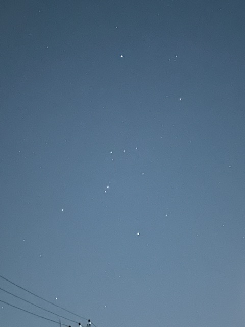 ギリシア神話の狩人オリオンの名に由来する冬の星座。赤色のベテルギウス、青白色のリゲル、二つの1等星を対角に大きな四辺形を形成する。真冬の夜に真東から上がり、夜半に南中し、明け方に真西に没する。オリオンの腰の帯を示す三つの星は、数多い星の中でもとりわけ目を惹く。別名「三つ星」。