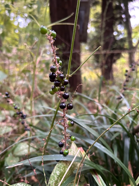 「藪蘭(やぶらん)」は、日本原産のキジカクシ科の常緑の多年草。各地の林床などに自生するほか、観賞用に庭園などに植えられる。8月から10月に長い穂を伸ばして、青紫から白色の花を咲かせる。その後実がなり、黒く熟す。俳句で単に「藪蘭」と言えば花の咲いている藪蘭こと。