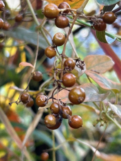 屁糞葛(へくそかずら)は日本全土に普通に見られる蔓性の多年草。他の植物やフェンスに絡まりながら成長し、晩夏の頃鐘状の小さい花をつける。全体に悪臭があることからこの名がある。別名「灸花(やいとばな)」。開花後、秋が深まると果実が飴色に熟し、鳥によって種子が散布される。なお、「屁糞葛の実」は歳時記に掲載されていない。