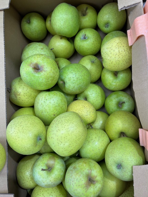 下の写真は晩生種である王林。収穫して間もなく店頭に並ぶ。。