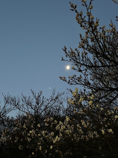 梅が咲いている月夜のこと。春先のほんのり潤った月光が冷え冷えと梅の花を照らし出す。月光に誘い出されたかのように、梅の香が辺りに満ちる。梅はバラ科サクラ属の落葉高木で、開花時期は早春の頃。葉に先立って咲く花には気品ある香りがある。「梅」(春季)の傍題。