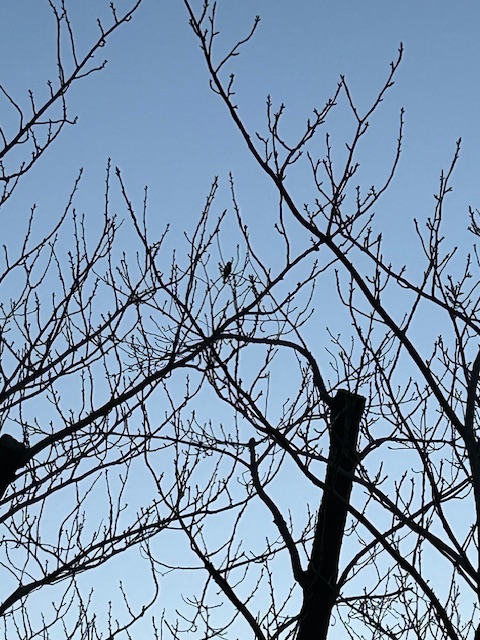 春になり繁殖期を迎えた小鳥たちの、求愛や縄張りを知らせる鳴き声のこと。私の近辺では初春の頃から真っ先に囀り始めるのがシジュウカラ、続いてホオジロやメジロ。ウグイスの初音が聞かれるのは仲春の頃。ヒバリの声を聞くのは春も深まってくる頃だ。それまでは藪などに潜んで地鳴きと呼ばれる短い鳴き声を発するだけだった小鳥たちが、春の繁殖期になると高い梢などに姿を見せ、美しい声で囀りはじめる。下の写真は芽吹き前の梢で囀りはじめたシジュウカラ。