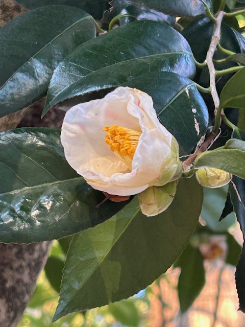 白花の椿。野生のヤブツバキの白花をさす場合が多いが、栽培品種のうち花が白色のものの総称名として用いることもある。白色の一重咲きは「白玉」とも呼ばれる。椿はツツジ目ツバキ科ツバキ属の常緑高木。花色はピンク(桃色)、赤、白、黄色、複色がある。