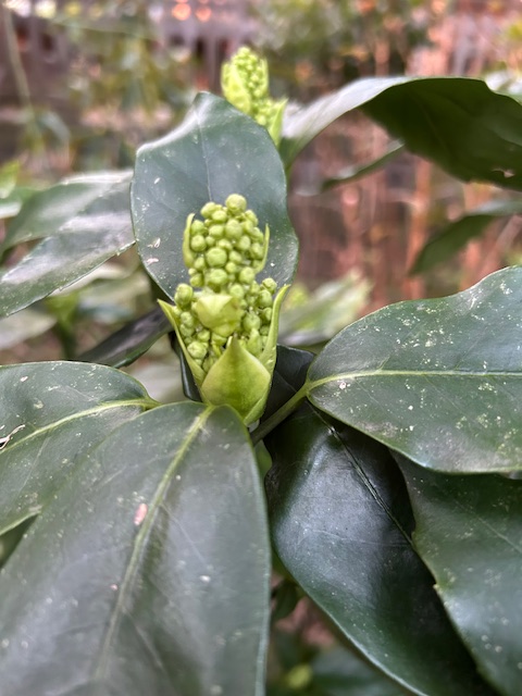 「青木」は、本州、四国の暖温帯林下に分布する日本特産の常緑樹。花は単性花で、雄花と雌花に分かれ、それらが別々の個体につく雌雄異株。春になると花芽・葉芽がほぐれ始める。花が咲くのは晩春の頃。「青木の芽」は「木の芽」(春季)の傍題。下の写真は雌花の芽。