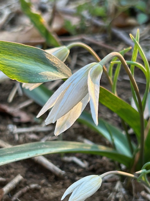 ユリ科の多年草。別名「麦慈姑(むぎくわい)」。東北以南の山野、山麓、樹林、土手などに自生する。春、茎頭に釣鐘形の花を一個ずつつける。六枚の白い花びらの外側には赤紫色の筋がある。葉や鱗茎には甘みがあり食用にもされた。
