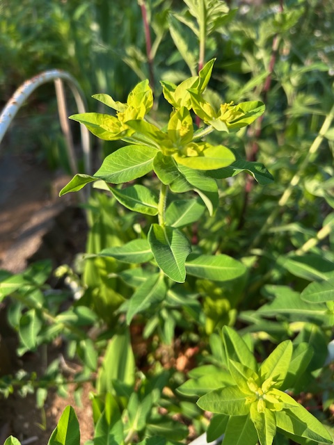 トウダイグサ科の越年草。全国の田畑、路傍、土手等に自生する。有毒植物で、キズをつけると乳液を出し、それが膚につくとかぶれる。形状が灯明をおいた台に似ていることからこの名がある。晩春の頃、茎の先が5つに枝分かれし、その先端に葉を五個輪生し黄緑色の杯状花序をつける。別名「鈴振花」。