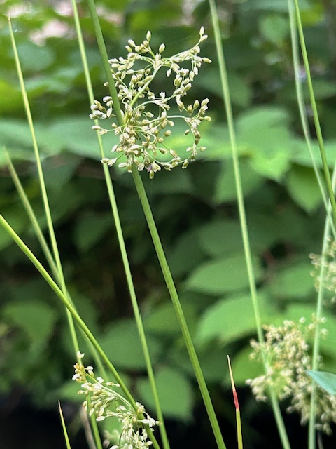 藺(い)はイグサ科の多年草。山野、湿地に自生するほか、水田などで栽培される。5、6月頃、茎の先端に花穂をつけ、緑褐色の小花を密に咲かせる。茎は筵や畳表の材料になる。別名「燈心草」。