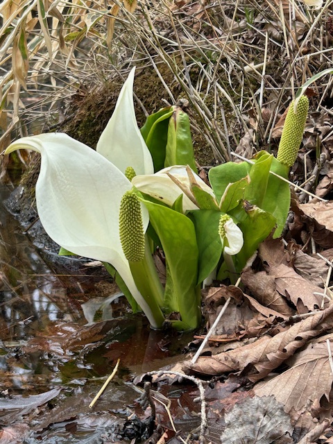 サトイモ科の大形多年草。主に中部以北の山地の湿原に自生する。地下に大きな球状の根茎があり、初夏の雪解けの頃、雪白色の仏炎苞(ぶつえんほう)を持った黄緑色の花穂を出す。葉は芭蕉に似ている。