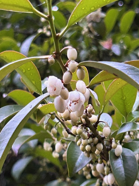 「榊(さかき)」はツバキ科の常緑小高木で、暖地の山林に自生する。名の由来は、神と人との境の木、すなわち「境木(さかき)」の意であるとされる。枝葉を神棚や祭壇に供えるなど、神事には欠かせない。6、7月に、葉の腋から香りのある白い花を下向きにひっそりと咲かせる。花はやがて淡黄色に変わる。晩秋の頃には黒く小さな実をつける。