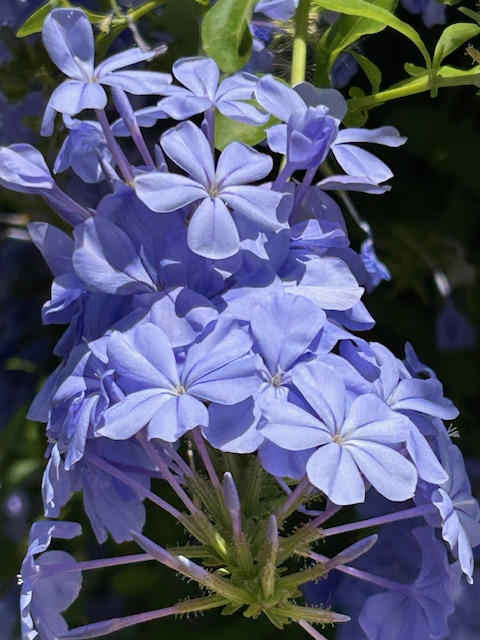 南アフリカ原産のイソマツ科ルリマツリ属(プルンバゴ属)の蔓性常緑低木。別名プルンバゴ。瑠璃色で花の姿がジャスミンの仲間マツリカに似ているところからこの名がある。初夏から晩秋まで長期間にわたって次々と花をつける。日本への渡来時期は不詳。なお、歳時記には掲載されていない。