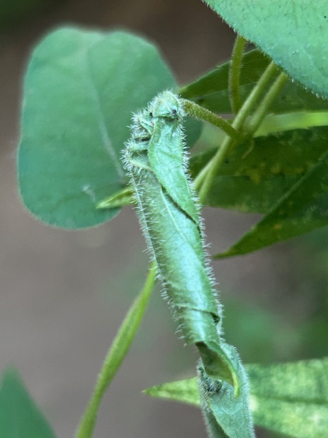 下の写真はタバコスズメガの幼虫が葉を巻いて蛹になろうとしているところ。形状は似ているが、厳密にいえば「落し文」ではない。