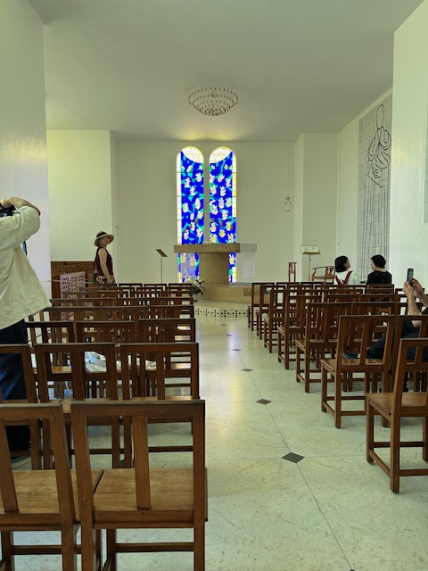 マティスが設計や装飾を手がけたロザリオ礼拝堂を訪れることは、今回の旅行の動機の一つだった。ヴァンスの旧市街からほど近いこの礼拝堂について、マティスは「これこそ私の生涯の傑作」と言ったという。行きずりに訪れた大聖堂などの絢爛豪華な印象とは対照的に、祈りの空間を作り出す簡素な線と色が印象に残った。その静謐な場は色と光の調和を求めたマティスの晩年の到達点なのだろう。